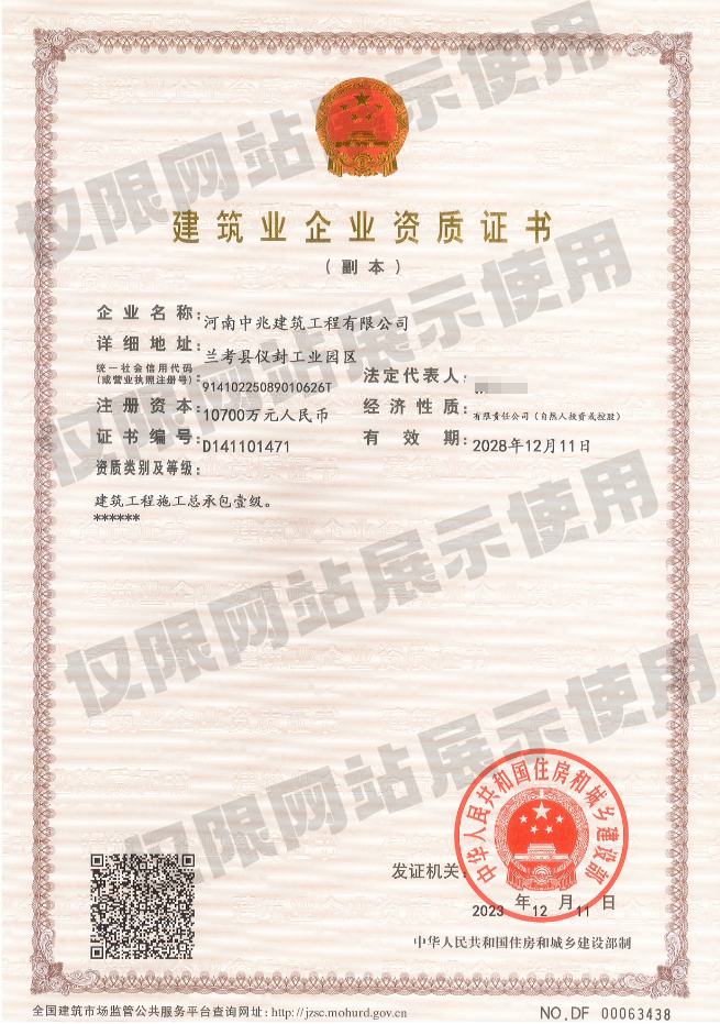 • 河南中兆建筑工程有限公司成立于2013年,公司注冊資本10700萬元,凈資產(chǎn)總額近1.9億元。公司目前具有“建筑工程、市政公用工程、鋼結構工程、建筑機電安裝工程、建筑裝修裝飾工程、地基與基礎工程、消防設施工程、壓力管道”等17個資質(zhì)。現(xiàn)有從業(yè)人員2150人,具有中高級各類專業(yè)技術職稱管理人員達120人,壹級、貳級建造師約90余人;主要施工設備300多臺(套)。通過了ISO9001質(zhì)量管理體系認證、職業(yè)健康安全管理體系認證、環(huán)境管理體系認證,并多次獲得省級“AAA”信用企業(yè)、“重合同守信用”、“先進建筑企業(yè)...